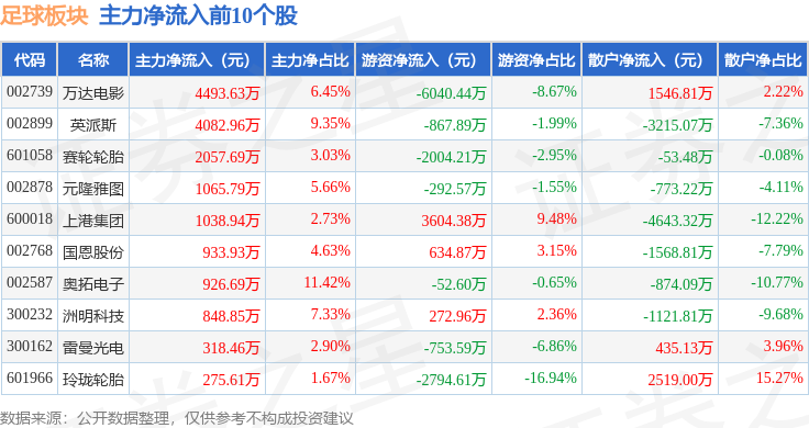 从资金流向上来看,当日足球板块主力资金净流入4320.98万元,游资资金净流出6291.47万元,散户资金净流入1970.5万元。足球板块个股资金流向见下表: