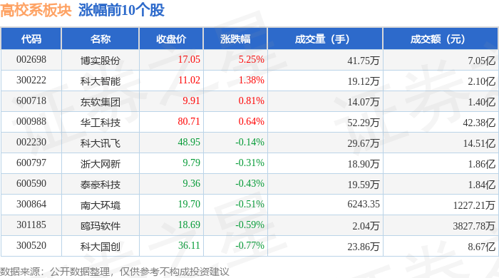 证券之星消息,12月30日高校系板块较上一交易日上涨0.05%,博实股份领涨。当日上证指数报收于3965.12,下跌0.0%。深证成指报收于13604.07,上涨0.49%。高校系板块个股涨跌见下表: