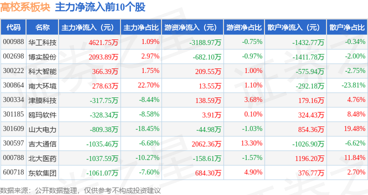 从资金流向上来看,当日高校系板块主力资金净流出5.18亿元,游资资金净流出698.63万元,散户资金净流入5.25亿元。高校系板块个股资金流向见下表: