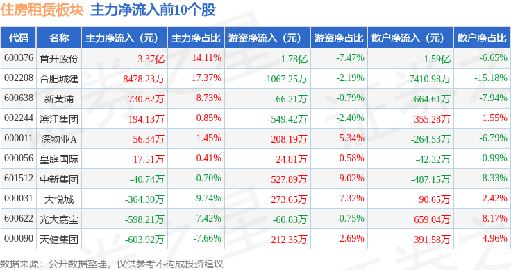从资金流向上来看,当日住房租赁板块主力资金净流出2.46亿元,游资资金净流出26.22万元,散户资金净流入2.46亿元。住房租赁板块个股资金流向见下表: