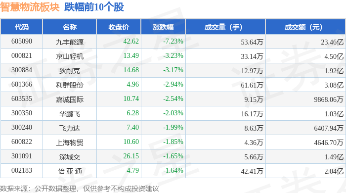 从资金流向上来看,当日智慧物流板块主力资金净流入1441.28万元,游资资金净流出1.07亿元,散户资金净流入9289.1万元。智慧物流板块个股资金流向见下表: