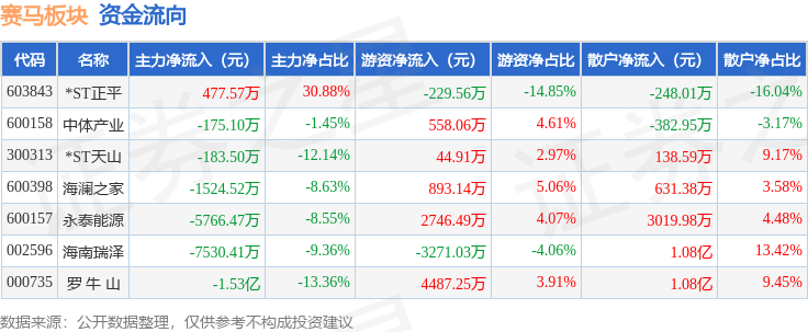 从资金流向上来看,当日赛马板块主力资金净流出3.0亿元,游资资金净流入5229.25万元,散户资金净流入2.48亿元。赛马板块个股资金流向见下表: