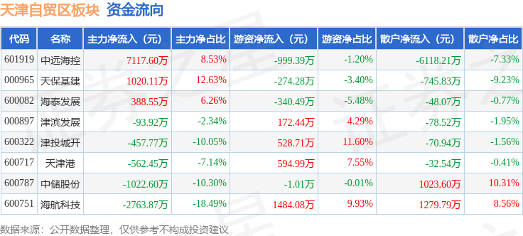 从资金流向上来看,当日天津自贸区板块主力资金净流入3625.66万元,游资资金净流入1165.06万元,散户资金净流出4790.71万元。天津自贸区板块个股资金流向见下表: