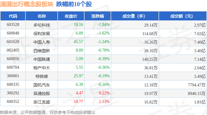 证券之星消息,12月30日滴滴出行概念股板块较上一交易日下跌0.76%,多伦科技领跌。当日上证指数报收于3965.12,下跌0.0%。深证成指报收于13604.07,上涨0.49%。滴滴出行概念股板块个股涨跌见下表: