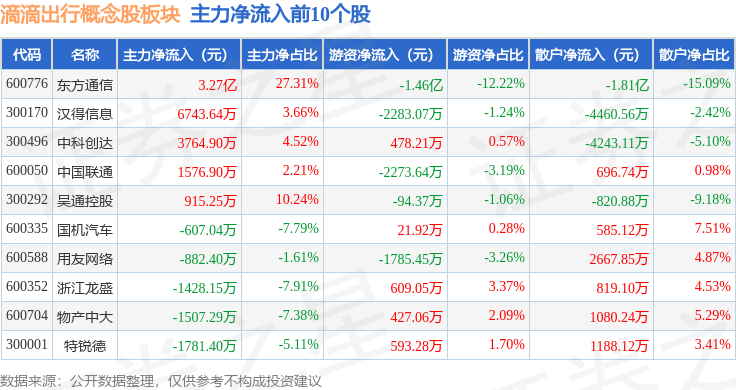 从资金流向上来看,当日滴滴出行概念股板块主力资金净流入1.04亿元,游资资金净流出1.52亿元,散户资金净流入4837.56万元。滴滴出行概念股板块个股资金流向见下表:
