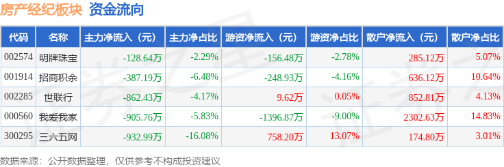从资金流向上来看,当日房产经纪板块主力资金净流出3217.02万元,游资资金净流出1034.46万元,散户资金净流入4251.48万元。房产经纪板块个股资金流向见下表: