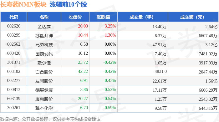 证券之星消息,12月30日长寿药NMN板块较上一交易日下跌0.64%,双鹭药业领跌。当日上证指数报收于3965.12,下跌0.0%。深证成指报收于13604.07,上涨0.49%。长寿药NMN板块个股涨跌见下表:
