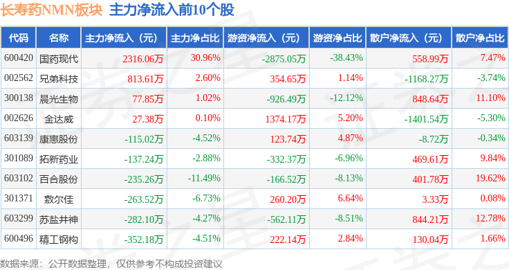 从资金流向上来看,当日长寿药NMN板块主力资金净流出2.12亿元,游资资金净流出5500.26万元,散户资金净流入2.67亿元。长寿药NMN板块个股资金流向见下表: