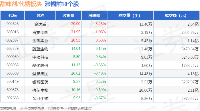 证券之星消息,12月30日甜味剂/代糖板块较上一交易日下跌0.67%,凯盛新材领跌。当日上证指数报收于3965.12,下跌0.0%。深证成指报收于13604.07,上涨0.49%。甜味剂/代糖板块个股涨跌见下表: