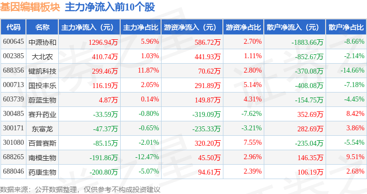 从资金流向上来看,当日基因编辑板块主力资金净流出4.33亿元,游资资金净流入9086.09万元,散户资金净流入3.42亿元。基因编辑板块个股资金流向见下表: