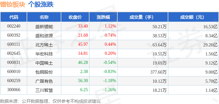 从资金流向上来看,当日镨钕板块主力资金净流出6824.56万元,游资资金净流出3.49亿元,散户资金净流入4.17亿元。镨钕板块个股资金流向见下表: