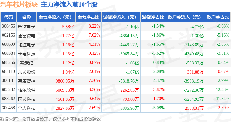 从资金流向上来看,当日汽车芯片板块主力资金净流出11.91亿元,游资资金净流入2.16亿元,散户资金净流入9.75亿元。汽车芯片板块个股资金流向见下表: