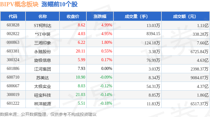 证券之星消息,12月30日BIPV概念板块较上一交易日下跌1.47%,*ST天龙领跌。当日上证指数报收于3965.12,下跌0.0%。深证成指报收于13604.07,上涨0.49%。BIPV概念板块个股涨跌见下表: