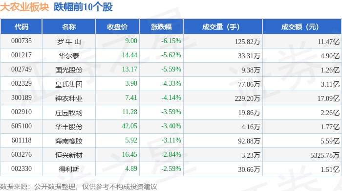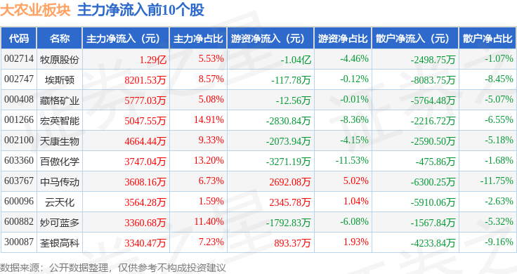 从资金流向上来看,当日大农业板块主力资金净流出4.27亿元,游资资金净流出1.54亿元,散户资金净流入5.81亿元。大农业板块个股资金流向见下表: