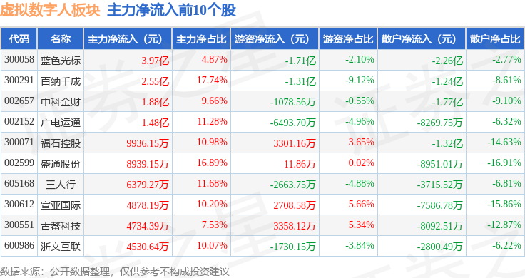 从资金流向上来看,当日虚拟数字人板块主力资金净流入1.47亿元,游资资金净流入4.04亿元,散户资金净流出5.51亿元。虚拟数字人板块个股资金流向见下表: