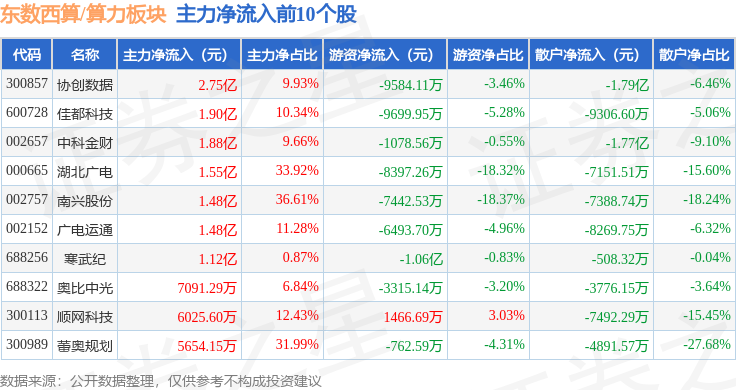 从资金流向上来看,当日东数西算/算力板块主力资金净流出44.2亿元,游资资金净流入5.84亿元,散户资金净流入38.36亿元。东数西算/算力板块个股资金流向见下表:
