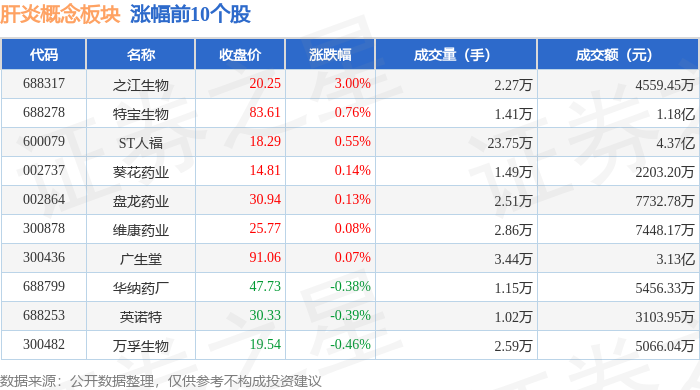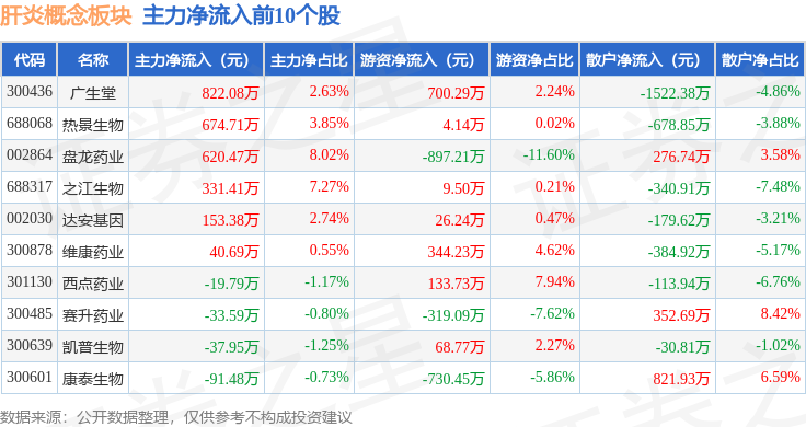 从资金流向上来看,当日肝炎概念板块主力资金净流出1.78亿元,游资资金净流入3950.01万元,散户资金净流入1.39亿元。肝炎概念板块个股资金流向见下表: