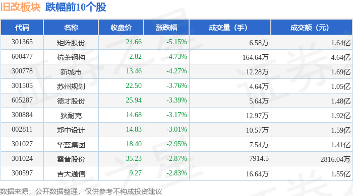 证券之星消息,12月30日旧改板块较上一交易日下跌0.84%,矩阵股份领跌。当日上证指数报收于3965.12,下跌0.0%。深证成指报收于13604.07,上涨0.49%。旧改板块个股涨跌见下表: