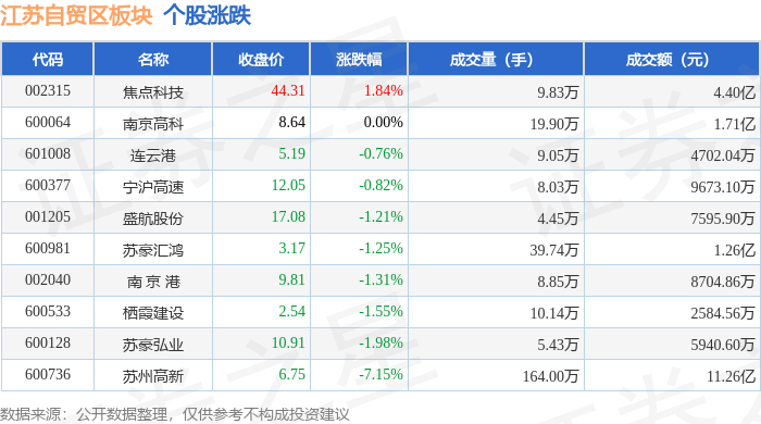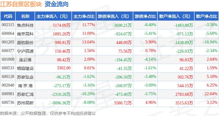 从资金流向上来看,当日江苏自贸区板块主力资金净流出3468.75万元,游资资金净流入305.22万元,散户资金净流入3163.53万元。江苏自贸区板块个股资金流向见下表: