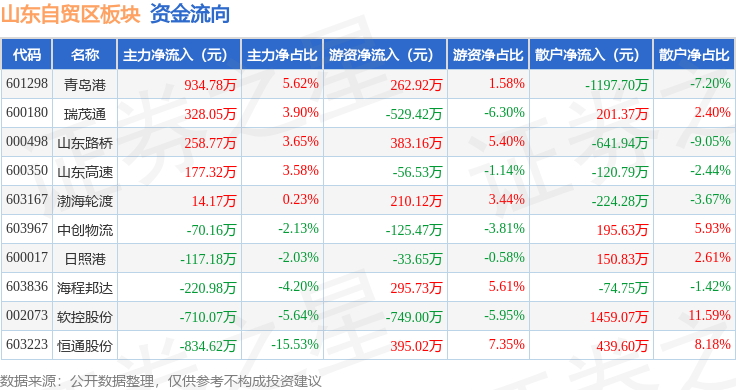 从资金流向上来看,当日山东自贸区板块主力资金净流出239.92万元,游资资金净流入52.88万元,散户资金净流入187.04万元。山东自贸区板块个股资金流向见下表: