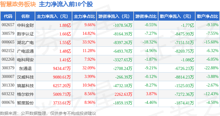 从资金流向上来看,当日智慧政务板块主力资金净流出40.47亿元,游资资金净流入9.56亿元,散户资金净流入30.91亿元。智慧政务板块个股资金流向见下表: