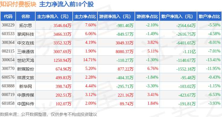 从资金流向上来看,当日知识付费板块主力资金净流出1260.73万元,游资资金净流入1.46亿元,散户资金净流出1.33亿元。知识付费板块个股资金流向见下表: