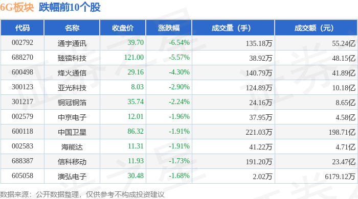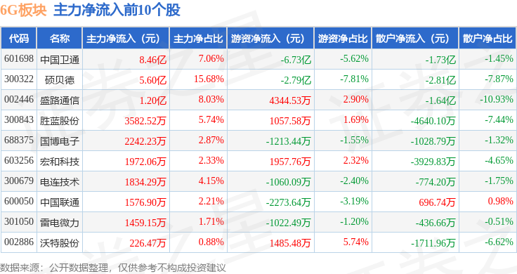 从资金流向上来看,当日6G板块主力资金净流出38.47亿元,游资资金净流入5.62亿元,散户资金净流入32.85亿元。6G板块个股资金流向见下表: