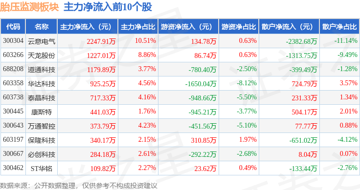 从资金流向上来看,当日胎压监测板块主力资金净流出1.31亿元,游资资金净流出1.35亿元,散户资金净流入2.66亿元。胎压监测板块个股资金流向见下表: