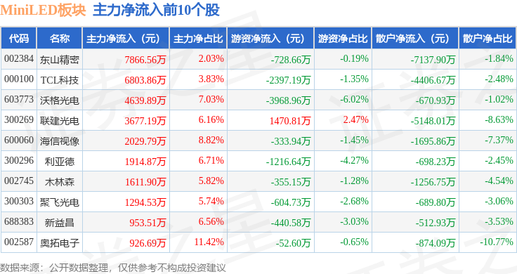 从资金流向上来看,当日MiniLED板块主力资金净流出24.78亿元,游资资金净流入7.71亿元,散户资金净流入17.07亿元。MiniLED板块个股资金流向见下表: