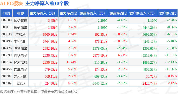 从资金流向上来看,当日AI PC板块主力资金净流入4016.82万元,游资资金净流出4.11亿元,散户资金净流入3.7亿元。AI PC板块个股资金流向见下表: