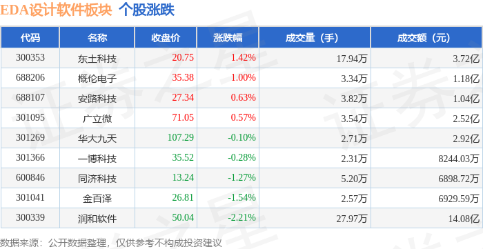 证券之星消息,12月30日EDA设计软件板块较上一交易日下跌0.28%,润和软件领跌。当日上证指数报收于3965.12,下跌0.0%。深证成指报收于13604.07,上涨0.49%。EDA设计软件板块个股涨跌见下表: