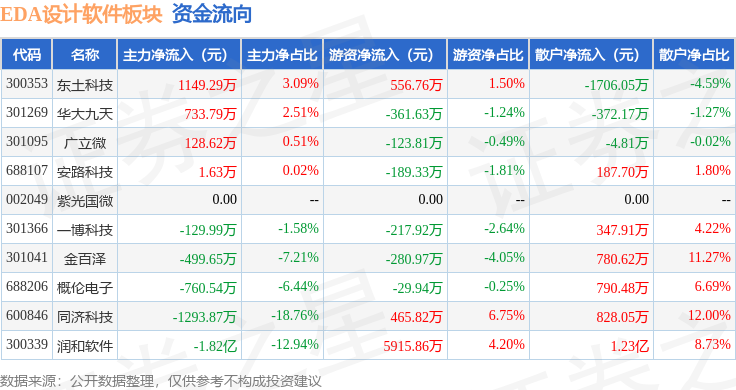 从资金流向上来看,当日EDA设计软件板块主力资金净流出1.89亿元,游资资金净流入5734.83万元,散户资金净流入1.32亿元。EDA设计软件板块个股资金流向见下表:
