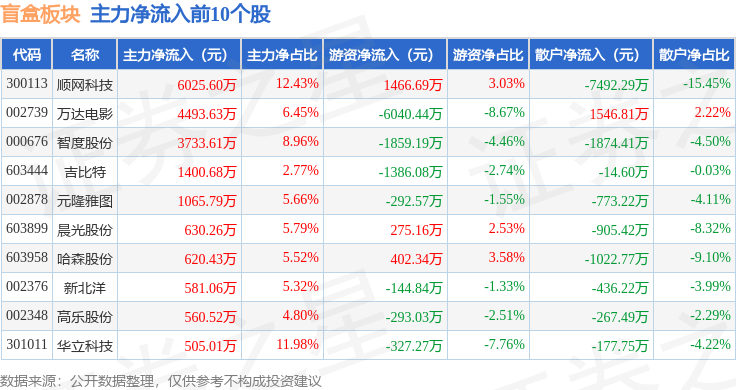 从资金流向上来看,当日盲盒板块主力资金净流入1.48亿元,游资资金净流出7767.16万元,散户资金净流出7042.26万元。盲盒板块个股资金流向见下表: