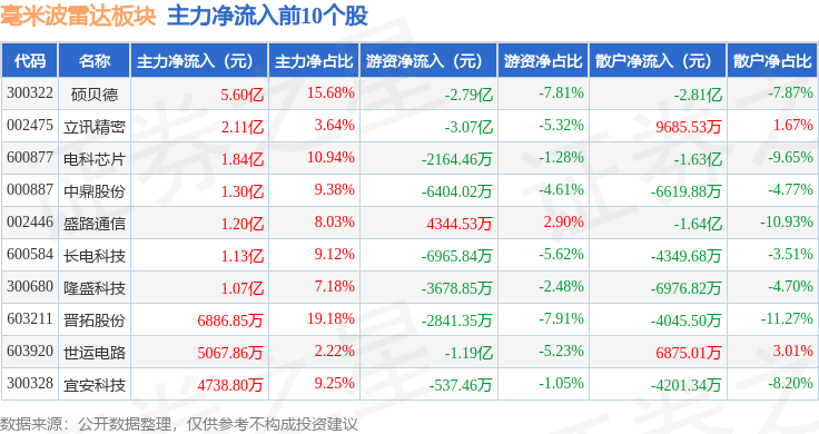从资金流向上来看,当日毫米波雷达板块主力资金净流出18.49亿元,游资资金净流出2.62亿元,散户资金净流入21.11亿元。毫米波雷达板块个股资金流向见下表: