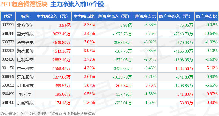 从资金流向上来看,当日PET复合铜箔板块主力资金净流出3.67亿元,游资资金净流出4.44亿元,散户资金净流入8.11亿元。PET复合铜箔板块个股资金流向见下表: