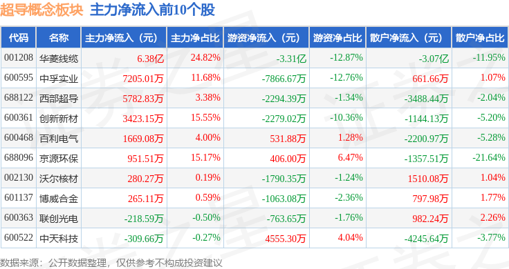 从资金流向上来看,当日超导概念板块主力资金净流入2.76亿元,游资资金净流出2.95亿元,散户资金净流入1882.68万元。超导概念板块个股资金流向见下表: