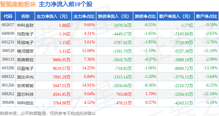从资金流向上来看,当日智能座舱板块主力资金净流出1.99亿元,游资资金净流入1.54亿元,散户资金净流入4545.24万元。智能座舱板块个股资金流向见下表: