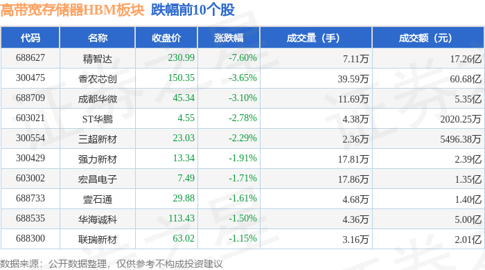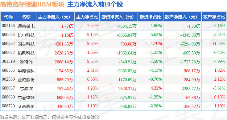 从资金流向上来看,当日高带宽存储器HBM板块主力资金净流出13.33亿元,游资资金净流入1.91亿元,散户资金净流入11.42亿元。高带宽存储器HBM板块个股资金流向见下表:
