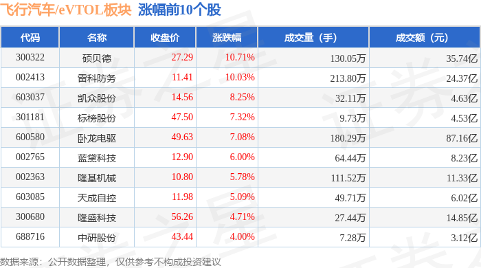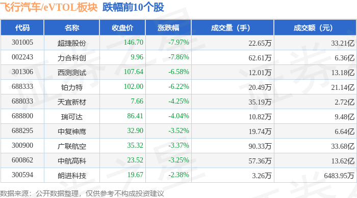 从资金流向上来看,当日飞行汽车/eVTOL板块主力资金净流出8.4亿元,游资资金净流出2.54亿元,散户资金净流入10.94亿元。飞行汽车/eVTOL板块个股资金流向见下表: