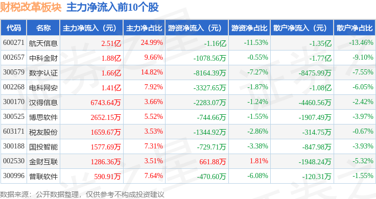 从资金流向上来看,当日财税改革板块主力资金净流入4.52亿元,游资资金净流出1.7亿元,散户资金净流出2.82亿元。财税改革板块个股资金流向见下表: