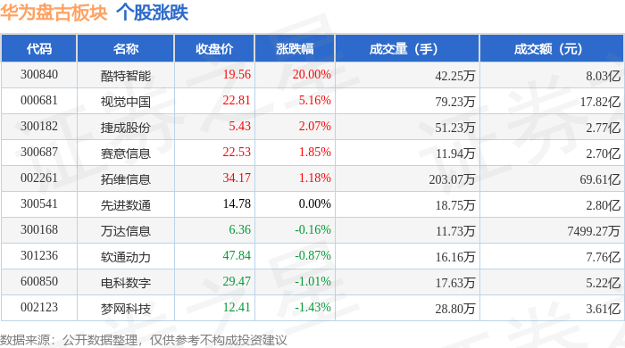 证券之星消息,12月30日华为盘古板块较上一交易日上涨0.95%,酷特智能领涨。当日上证指数报收于3965.12,下跌0.0%。深证成指报收于13604.07,上涨0.49%。华为盘古板块个股涨跌见下表: