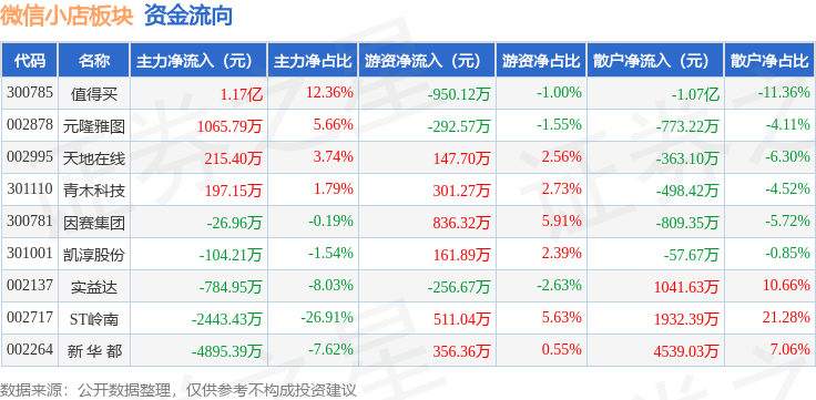 从资金流向上来看,当日微信小店板块主力资金净流入4917.64万元,游资资金净流入815.22万元,散户资金净流出5732.86万元。微信小店板块个股资金流向见下表: