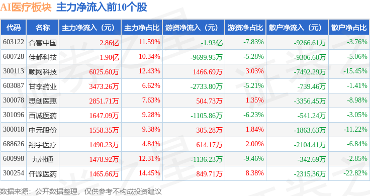 从资金流向上来看,当日AI医疗板块主力资金净流出20.04亿元,游资资金净流入4.07亿元,散户资金净流入15.98亿元。AI医疗板块个股资金流向见下表: