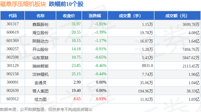 证券之星消息,12月30日磁悬浮压缩机板块较上一交易日下跌0.32%,鑫磊股份领跌。当日上证指数报收于3965.12,下跌0.0%。深证成指报收于13604.07,上涨0.49%。磁悬浮压缩机板块个股涨跌见下表: