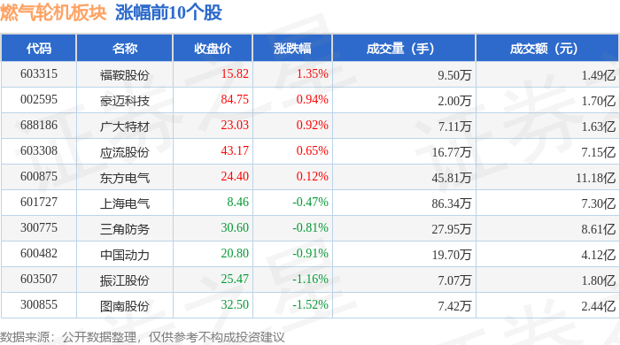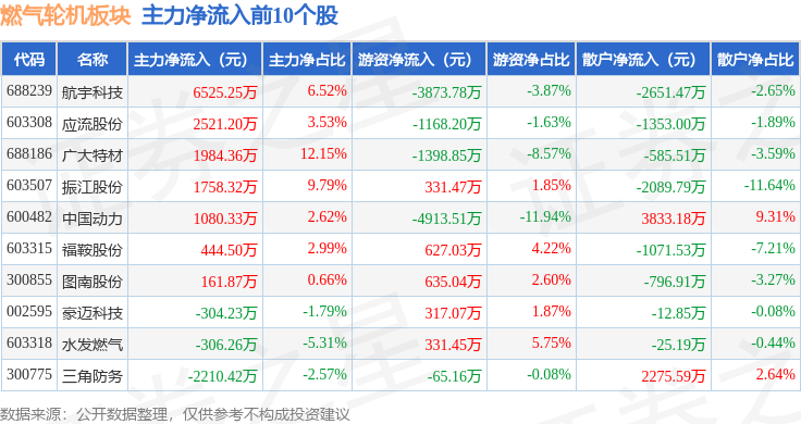 从资金流向上来看,当日燃气轮机板块主力资金净流出7.0亿元,游资资金净流出3810.81万元,散户资金净流入7.38亿元。燃气轮机板块个股资金流向见下表:
