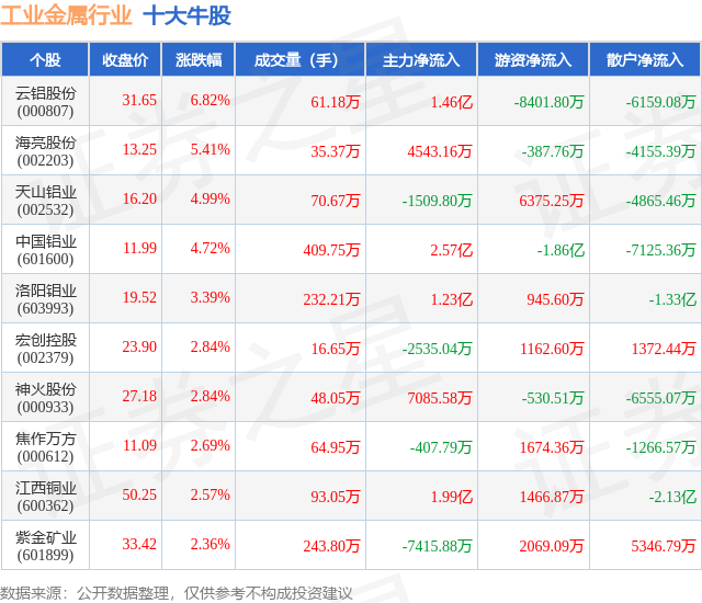 个股表现方面,工业金属行业当日领涨股为云铝股份(000807),该股当日报收31.65,上涨6.82%,成交量61.18万,主力资金净流入1.46亿元。海亮股份(002203)以上涨5.41%紧随其后,该股当日成交量35.37万,主力资金净流入4543.16万元。除此之外,天山铝业(002532)、中国铝业(601600)、洛阳钼业(603993)均进入当日牛股之列。具体个股列表见下表: