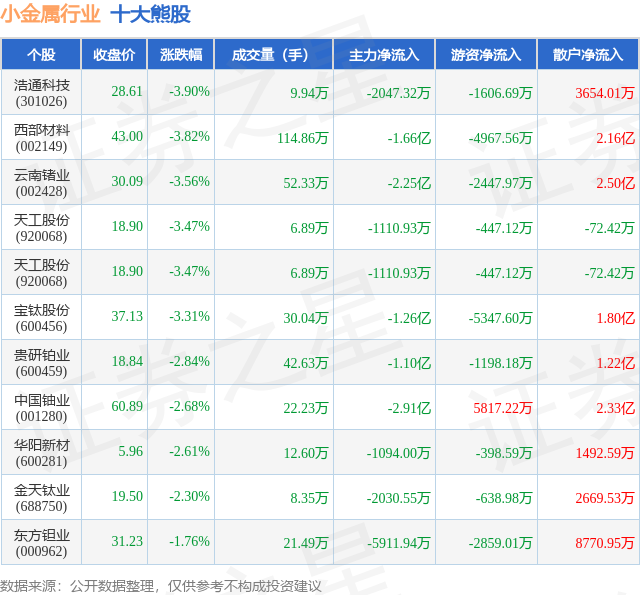 个股表现方面,小金属行业当日领跌股为浩通科技(301026),该股当日报收28.61,下跌3.9%,成交量9.94万,主力资金净流出2047.32万元。西部材料(002149)以下跌3.82%紧随其后,该股当日成交量114.86万,主力资金净流出1.66亿元。除此之外,云南锗业(002428)、天工股份(920068)、天工股份(920068)均进入当日熊股之列。具体个股列表见下表: