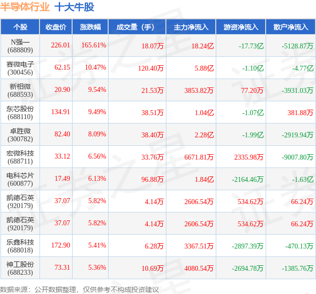 个股表现方面,半导体行业当日领涨股为N强一(688809),该股当日报收226.01,上涨165.61%,成交量18.07万,主力资金净流入18.24亿元。赛微电子(300456)以上涨10.47%紧随其后,该股当日成交量120.4万,主力资金净流入5.88亿元。除此之外,新相微(688593)、东芯股份(688110)、卓胜微(300782)均进入当日牛股之列。具体个股列表见下表: