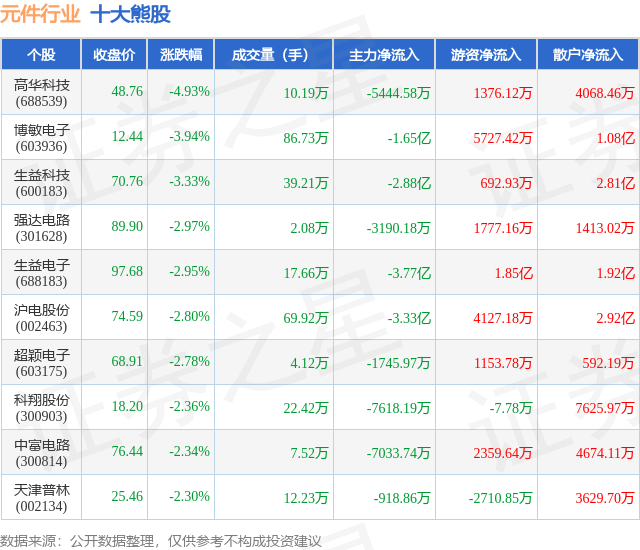个股表现方面,元件行业当日领跌股为高华科技(688539),该股当日报收48.76,下跌4.93%,成交量10.19万,主力资金净流出5444.58万元。博敏电子(603936)以下跌3.94%紧随其后,该股当日成交量86.73万,主力资金净流出1.65亿元。除此之外,生益科技(600183)、强达电路(301628)、生益电子(688183)均进入当日熊股之列。具体个股列表见下表: