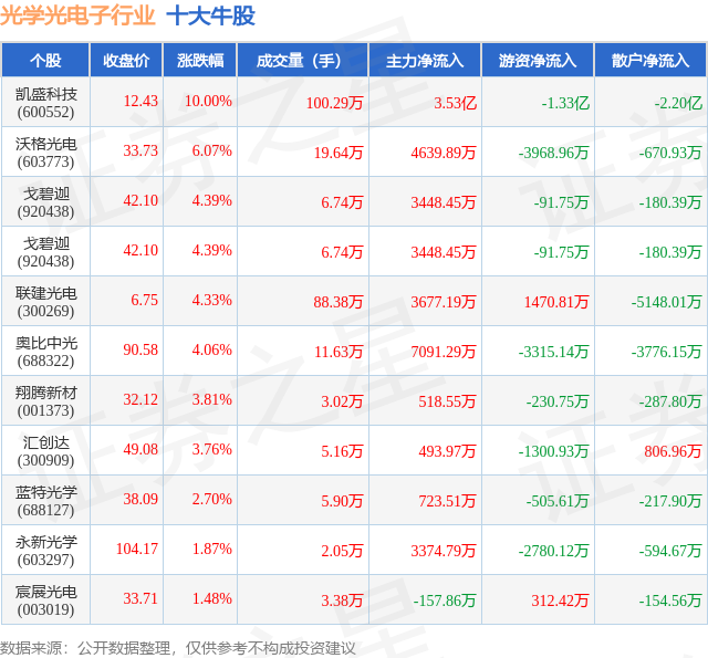 个股表现方面,光学光电子行业当日领涨股为凯盛科技(600552),该股当日报收12.43,上涨10.0%,成交量100.29万,主力资金净流入3.53亿元。沃格光电(603773)以上涨6.07%紧随其后,该股当日成交量19.64万,主力资金净流入4639.89万元。除此之外,戈碧迦(920438)、戈碧迦(920438)、联建光电(300269)均进入当日牛股之列。具体个股列表见下表: